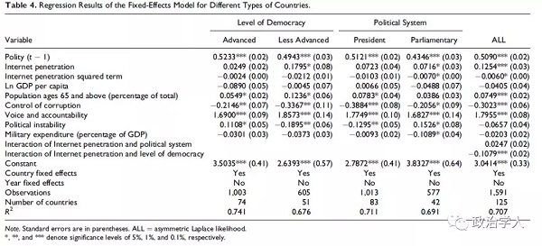 随后,作者用固定效应模型考察了互联网普及对不同类型国家的影响。