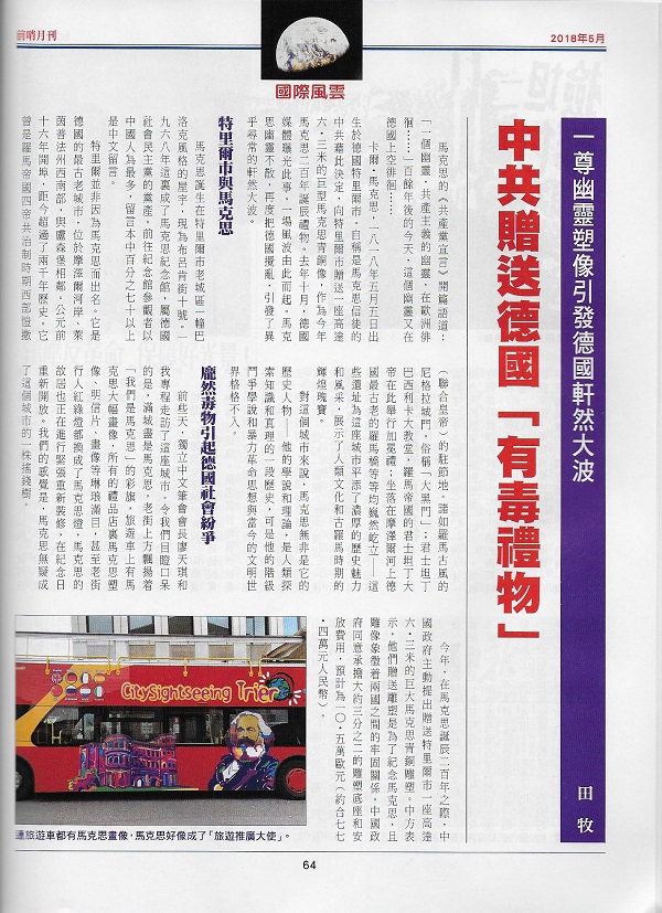 卡尔·马克思(Karl Marx),1818年5月5日出生于德国特里尔(Trier)市,自称是马克思信徒的中共政府藉此决定,向特里尔市赠送一座高达6.3米的巨型马克思青铜像,作为2018年马克思200年诞辰礼物。去年10月德国媒体曝光此事,一场风波由此而起,马克思幽灵不散,再度把德国搅乱,引发了异乎寻常的轩然大波。