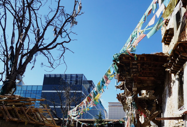 “神力·时代广场”紧挨着文革时沦为废墟的希德林佛殿,商业化与政治化构成拉萨写照。