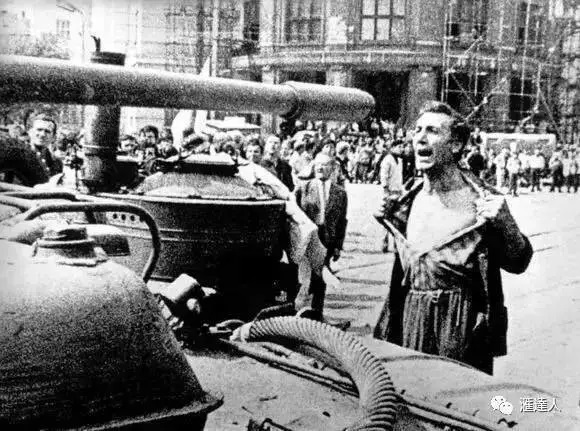 图:1968年8月20日深夜,20万苏联与华约成员国军队和5000辆坦克的武装入侵捷克首都布拉格,捷克人民走上街头,以血肉之躯与坦克大炮抵抗。