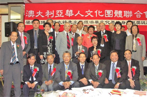 2008年11月7日,澳大利亚华人文化团体联合会向梁羽生大师(香港中文大学杨健思主任代领)敬颁“澳华文化界终身成就奖”。图为典礼上合照。