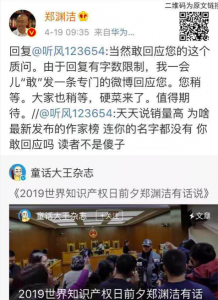 4月19日上午,郑渊洁转发并回应了该网友的微博。郑渊洁称”当然敢回应”,同时他表示由于回复有字数限制,会发一条专门的微博回应,并称将是”硬菜”。