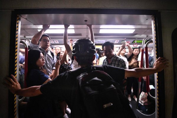 周一,在香港举行的大罢工中,一名抗议者封堵车门。 ANTHONY WALLACE/AGENCE FRANCE-PRESSE — GETTY IMAGES