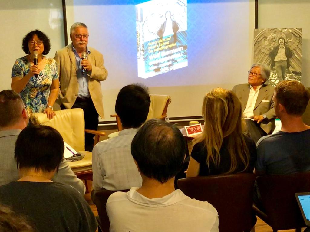 《唱垮柏林围墙的传奇诗人》一书的译者、独立中文笔会会长廖天琪首先介绍了翻译这本中文书的来龙去脉,台北的“诗歌节”邀请比尔曼访台与会,就有了今年2月比尔曼夫人潘蜜拉的电话请求,对我来说尽管是措手不及,但经翻阅,这是一本好书,书中讲述的经历与故事,虽说是东德黑幕时期,这也恰恰是今天中国的铁幕缩影与写照。我决定了,精力不够,时间再短,我也要帮助比尔曼夫妇这个心愿,在台北的“诗歌节”时出版新书。我用了5个月的时间,在6月份完成了此书的翻译工作。我不仅希望台湾读者能认识它了解它,更希望中国大陆的广大读者能读到此书,向比尔曼学习,模仿,用诗歌用文学手段,巧妙机智地与专制政权作斗争!