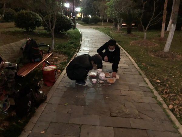 然而,公园里一个人也没有。根据线索,志愿者在另一个通道找到了人,是方建和盛宽两位老乡。他们得了被子,有位独立纪录片导演提了一大袋零食,坚持让他们收下了。