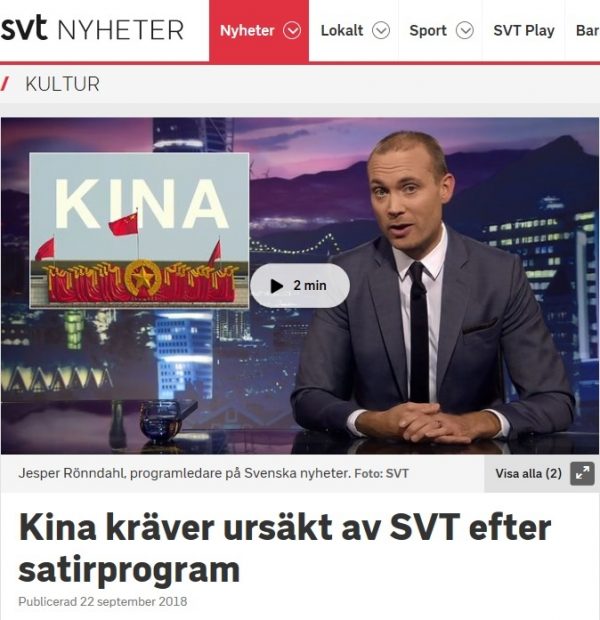 2018年9月21日,瑞典电视台(SVT)照常播发了由喜剧演员加斯帕·罗恩达尔(Jesper Rönndahl)主持的每星期五晚间十点为时半小时的脱口秀娱乐节目《瑞典新闻》(Svenska Nyheter),当晚节目约29分钟(点击观看,下同),前19分钟是讽刺和调侃瑞典近期时政和社会新闻,如取笑9月9日大选后,各党派在组建政府方面就像“小鸡赛跑”——缓慢烦人;就移民族群投票率低的问题时,放了主持人的Facebook朋友、《瑞典日报》主笔伊瓦尔·阿尔皮(Ivar Arpi)一小段相关谈话视频,并将其名字按字母反转成Ipra Ravi(伊普拉·拉维),调侃此名反转后就好像是孟加拉人名,说明有种融合只是颠倒了他的人头——显示了其PS的头像……。最后近10分钟,谈到有关中国人的话题,主题是“种族主义反华人”(Rasism mot kineser),从调侃上周所谓 “中国游客遭到瑞方公务人员粗暴对待”(见中国驻瑞典大使馆网站刊发的“旅游警报”)引发中瑞外交争端的原发事件起,讽刺在瑞典文化中的恐华症和种族主义倾向,挖苦瑞典政府虽偶谈中国人权问题但事实上更重贸易关系的虚伪表现,包括以文化差异来处置游客冲突问题的错位。