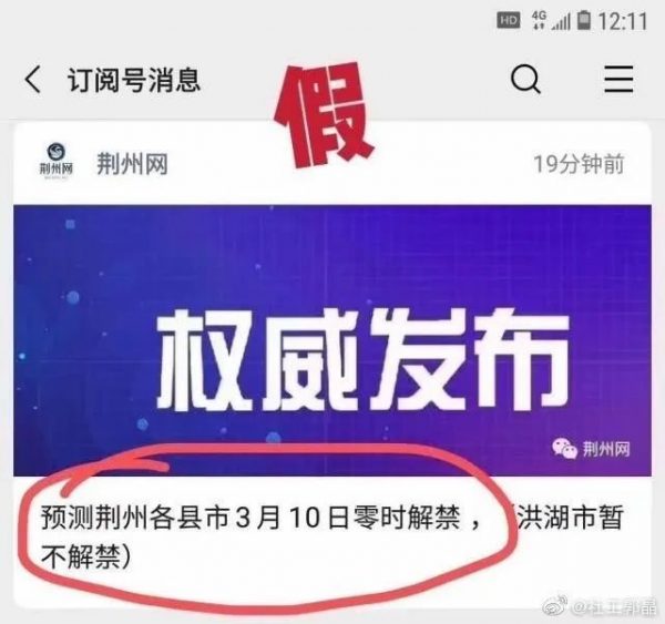 晚上,一个在湖北荆州的朋友说,昨天荆州网发了微信文章预测荆州各县市3月10日解禁,还写着“权威发布”。她说:“希望不要是假新闻。”我听到这个消息也很激动,任何一个城市的解封都是好消息,就问她要文章链接来看。她边找边开心地说:“解封了想去公园溜达。”