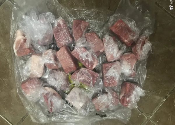 昨天下午6点多,物业的主任通知大家领购10元一斤的肉,每份4斤。我下楼买了肉。这次的肉是冷冻的,好切一些。我把肉分成21份,差不多够一个月吃了。