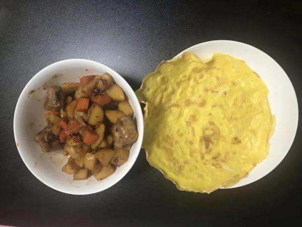 昨天的晚餐是土豆炖排骨加鸡蛋饼。