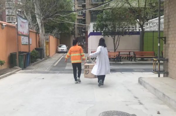 下午,我接到顺丰快递的电话,我三天前买的隐形眼镜护理液到了。我挂掉电话,穿上外套就出门,打开房门发现没戴口罩,又返回戴了口罩才下楼。一个穿着白大褂的女人也来取快递,她拿到的快递箱子的长宽都约有50cm,一个环卫工就帮她提到了快递柜前。