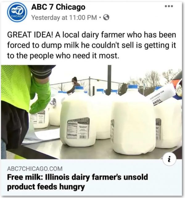 今天还看到一则消息:芝加哥当地有一个农场主,没有把卖不掉的牛奶倒掉,而是把这些牛奶免费赠送给了需要的人。