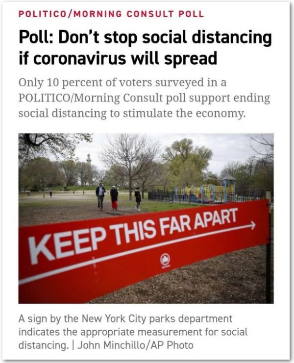 Morning Consult联合Politico近日发起的一份调查问卷显示,只有10%的人支持结束社交距离,重启经济。大约有75%的民众认为,当前控制病毒的扩散比搞好经济更重要。
