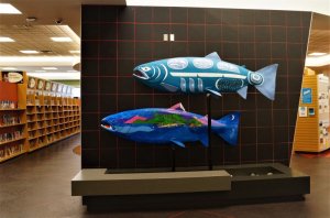 图二:卑诗省盛产三文鱼,渔业是卑诗省重要的经济产业。大温哥华地区(Great Vancouver)列治文市(Richmond City)的市旗就由三条三文鱼构成,三文鱼已经成为列治文市的标志。图为列治文公共图书馆大厅中成列的以三文鱼为主题的艺术品。由于新冠病毒疫情,图书馆至今已被迫关闭将近一个半月。(本文作者拍摄)