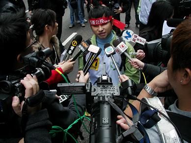 图十:两代人共同站出来为民主发声(之一)——游行队伍中的一对母子在接受记者采访。