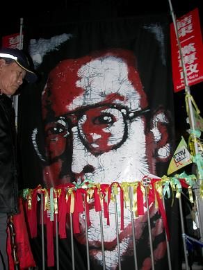图十七:游行民众散去后在刘晓波的大幅肖像前系上黄、红、绿各色丝带,表达声援之情。