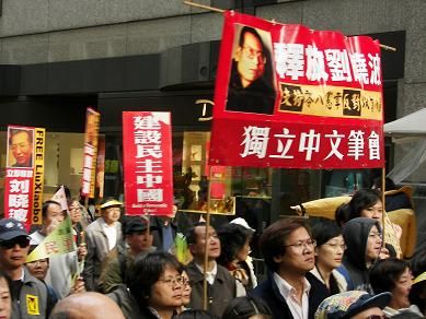 图一:民众在游行出发前的集会上,所持标语牌上书有“抗议重判刘晓波”、“立即释放刘晓波”。