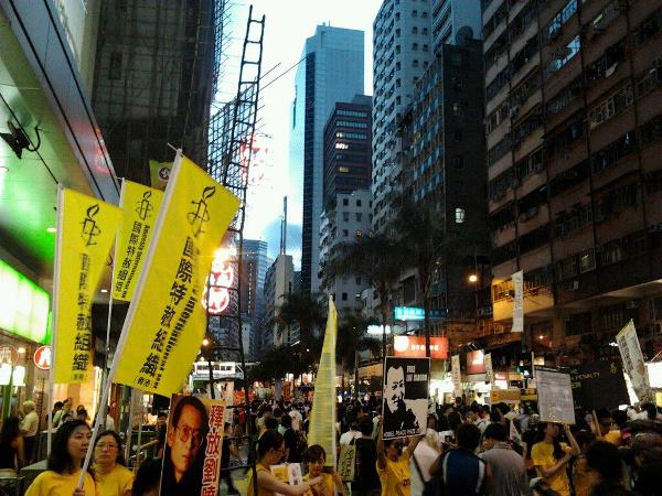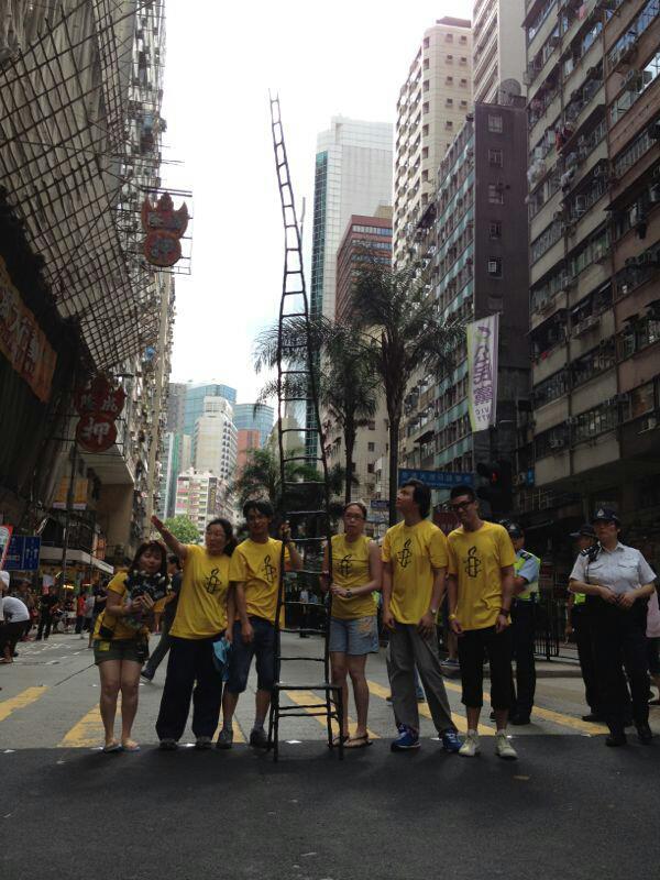 今天香港七一游行,我与国际特赦组织朋友一起,竖起荷兰建筑师Maarten Baas为刘晓波设计的五米高空椅子及要求释放刘晓波大牌,吸引很多游行人士拍照。[拍摄:国际特赦组织(香港)]
