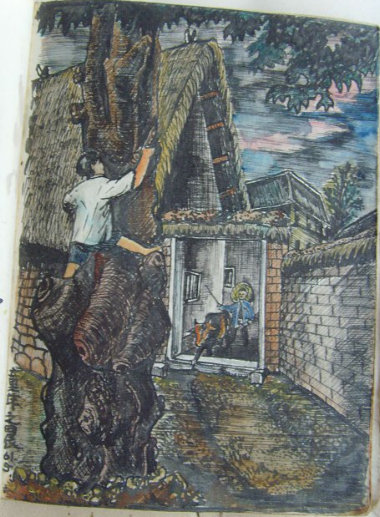 我没有照相机,为了给孤枫留个纪念,只好通过绘画手段描写下来。一幅是钢笔淡彩刻画了它疤瘤古怪的下半部,一幅是用水彩写生的葱蔚浓郁的上半部。同时,我在书画诗词作品中的署名都自号“孤枫居士”,以此表示我对古枫的留恋之情。