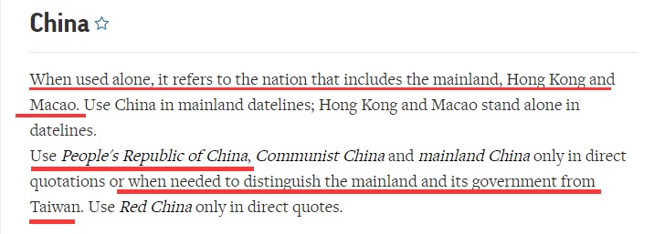 据美国新闻写作“圣经”《美联社写作风格指南》(AP Stylebook),“China”单独使用时,指代中国,包括(中国)大陆、香港和澳门。注意,按照这个规则,“China”并不囊括台湾。诸位读外媒想必经常发现,“Taiwan”总是与“China”并列出现,原因就在这里。