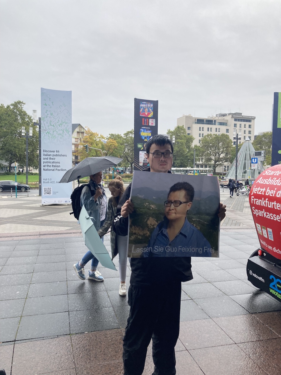 10月20日,正值世界最大图书展览会、德国法兰克福书展进行时,我在法兰克福会展中心门口,展示海报,呼吁释放政治犯许志永、郭飞雄、郝劲松,并展示“山河四省”平权海报。