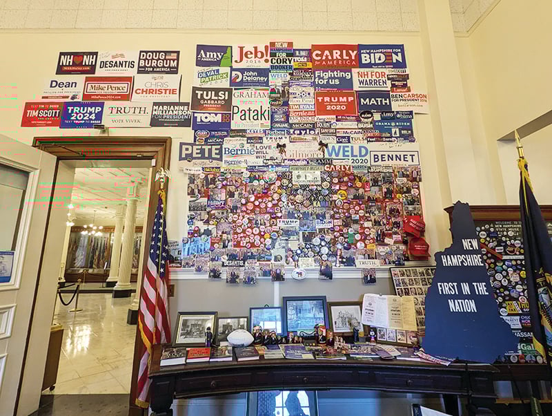 步入这座花岗石建筑大堂,首先映入眼帘是仿希腊复兴风格的大堂军旗厅,展出了新罕布什尔州参加过南北战争、美西战争、第一次世界大战、第二次世界大战和越战的107个军团的旗帜。右边是游客接待室,除了出售的纪念品,一面墙上还展出来访州府的美国政要的照片和像章,密密麻麻排满整面墙。原来美国总统大选的初选,自1952年开始,第一场就是在新罕布什尔州,于是该州的初选投票就有了选民倾向的标示,这个仅百万人的小州因此在美国大选中起到了杠杆的作用,很受国内外媒体关注,每个有意问鼎白宫的政客都会来到这个州亮相拉票。我在游客中心细看这些图片时,一群小学生在老师带领下进来参观。在老师讲解时,他们席地而坐,听得很入神。