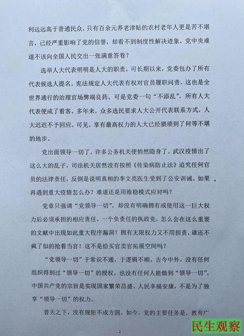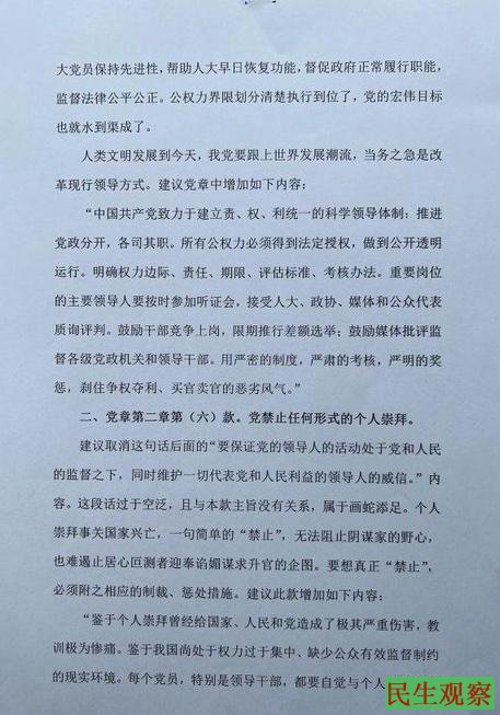 据悉,2022年8月22日,中共二十大前夕,董洪义、田奇庄、马贵全三位老党员联名发出公开信,建议中共二十大对党章做出两项重要修改:一、建议取消2017年党章总纲部分最后一个自然段中的一句话:“党政军民学,东西南北中,党是领导一切的。”