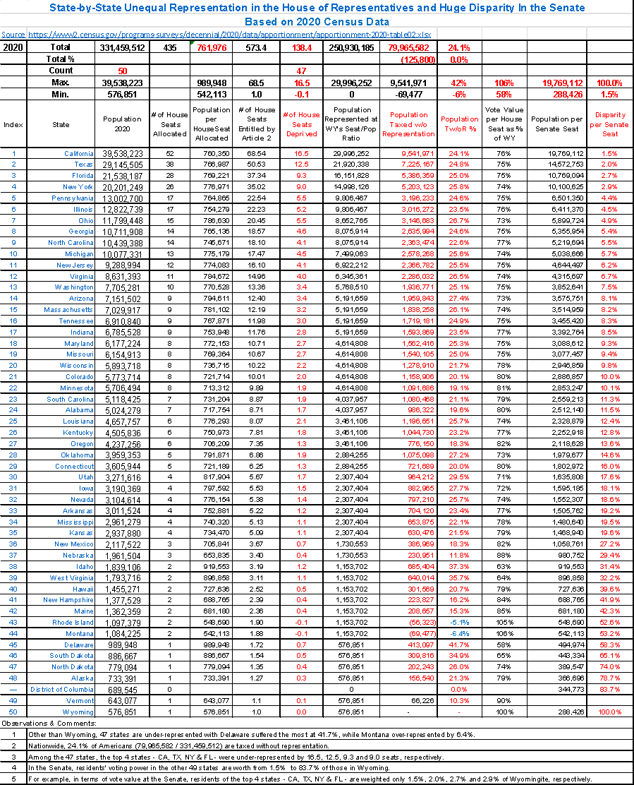 附表1:美国50个州的2020人口普查结果,众议院和参议院每个席位代表的平均人口比较
