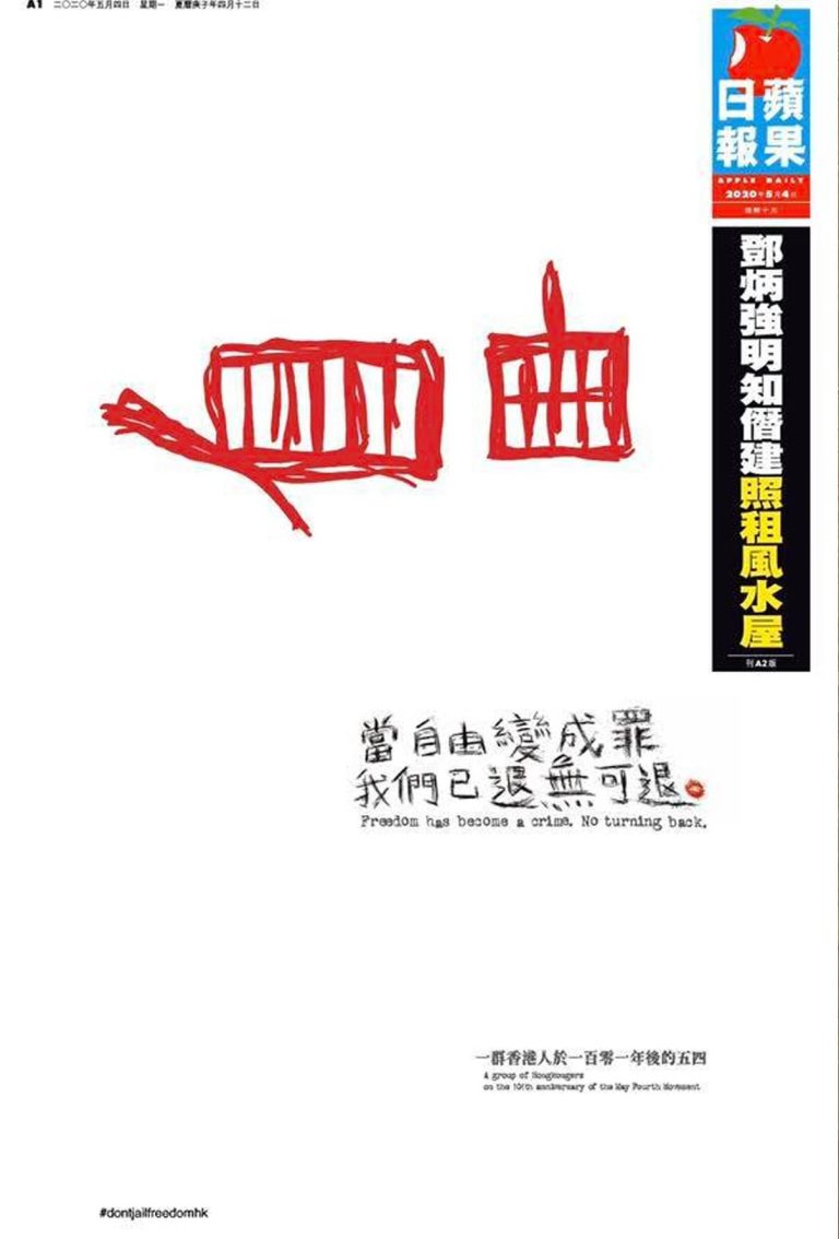控方于庭上展示《苹果》于 2020 年 5 月 4 日所刊登的广告,中间印有“自由”两红色大字,当中“自”字状似倒下,另配上字句“当自由变成罪 我们已退无可退”,下款为“一群香港人于一百零一年后的五四”。控方问,此广告如何成为《苹果》翌日文章“集体二创”的一部分?陈忆述,当时网民在社交平台各自创作及发表不同的“A1 广告”,《苹果》员工在网上看到相关创作,认为有趣及有创意,遂在“隔墙有耳”的版面刊登。陈补充“隔墙有耳”一般刊登政圈、议会“gossip (八卦)”的内容及软性文章等。