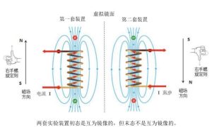 图2左边所示,是第一套装置的初态与末态。图2右边所示,是仿第一套装置初态之镜像而制成的第二套装置之初态与末态。图2左边螺线管内部末态磁力线是垂直向上的,而图2右边螺线管内部末态磁力线则是垂直向下的,二者的分布图案并不互为镜像。简单说来,初态是互为镜像的,但末态位形不是互为镜像的。