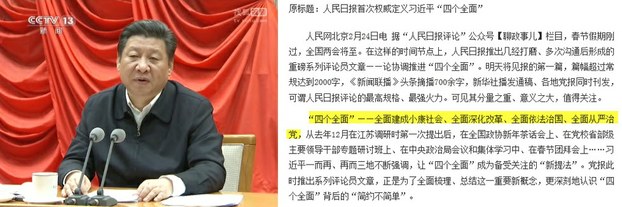 党媒开足马力,高分贝造势,意在将习近平的“四个全面”,与毛泽东思想、邓小平理论、“三个代表”(江理论)和科学发展观(胡理论)并列,成为“全党和全国人民”的又一个“指导思想”。