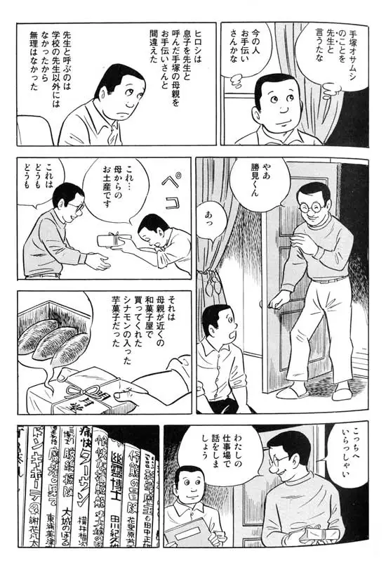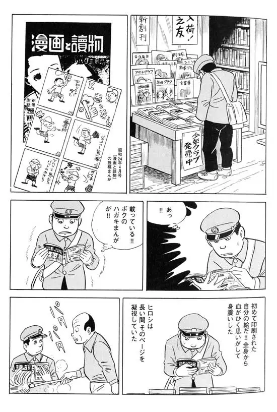 作为业内人士,辰巳嘉裕了解手冢治虫的境地,或者同一时代出身使他切身感受到来自手冢治虫对他个人印象的冲击,以及手冢治虫对社会造成的空前影响,似乎是不可磨灭的。然而,我们没有从他的书中看到更多的、创作者的敏感,他停留在社会层面、资历层面,他对手冢治虫的评价是人云亦云的,是崇拜者对手冢治虫朝圣。得到了手冢治虫的谒见心中的狂喜,这也许是作者青年时代的美好记忆,但是作为读者、后来者并不能完全理解、或认同。辰巳嘉裕在这里并没有更多地对手冢治虫具体的漫画进行评论,提起手冢治虫只是一个过场,手冢治虫就像开启了日本漫画的黄金时代一样,开启了他的剧画漂流人生。