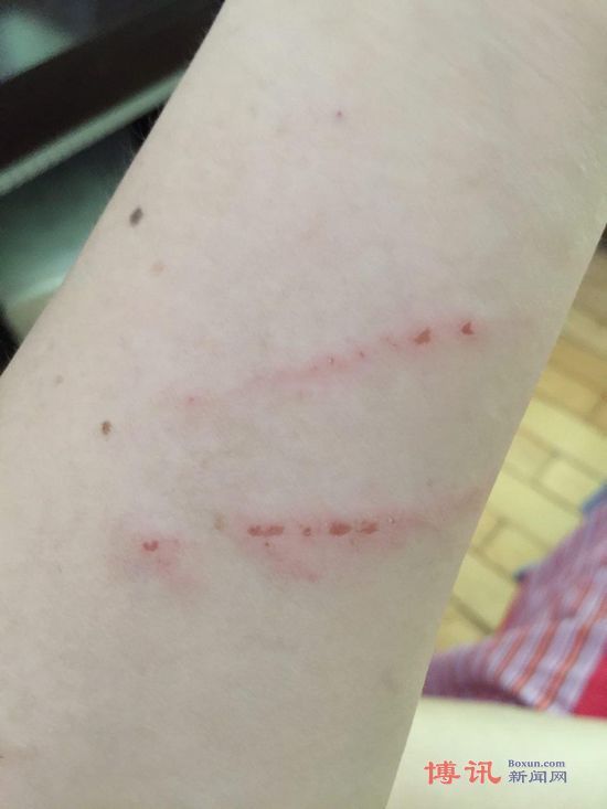 我的情况要比刘律好很多,只是两条手臂多处被恶警抓挠出一些较深的血痕和淤痕,虽疼痛持续数日(至发稿时,部分伤痕仍清晰可见),终无大碍。众恶警施暴持续约十分钟后,一位显然很熟悉我和刘律的施姓便装警官进入警车,态度客气,让我们先去开庭,冲突之事以后再说。毕竟开庭最紧要,我和刘律顾不上与恶警纠缠,马上出警车与其他四位律师汇合,披上黑色律师袍在中院门前合影后进入广州中院(为我们拍照的葛文秀律师之子随后被警方抓走)。