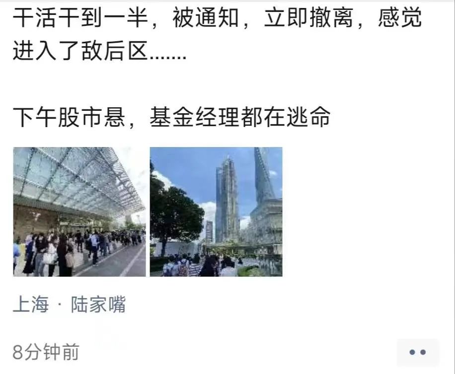 到了下午,传闻陆家嘴有办公楼紧急疏散,不知该算是久经世事还是人心惶惶,人们流传着一个笑谈:“今天下班前再好好看一眼同事吧,说不定下次再见面都要穿棉袄了。”