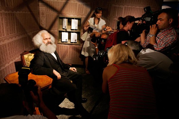 BERLIN - JULY 03: Journalists take pictures of a wax model of Karl Marx in the Berlin Branch of Madame Tussauds on July 3, in Berlin, Germany. The famous Madame Tussauds wax figure cabinett is due to open its location in Berlin on July 9th. (Photo by Steffen Kugler/Getty Images)