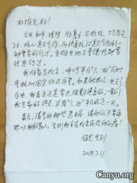 徐光走后,我就去看他条子上写些什么内容。一看,让我吓一跳,真如他当面与我所言,要去北京为“六四”平反呼吁。这马上让我想到了今年因为组织纪念“六四”25周年而被抓正在落难的浦志强、陈卫、于世文、姬来松等人。虽然各界正义力量都在积极营救,但前面被抓的还没有出来,刚刚获释的徐光又要去冒险犯难,此时我并没有佩服他那“壮志一去不复返”的勇气,而是感到事情似乎很糟糕,马上追出门去。