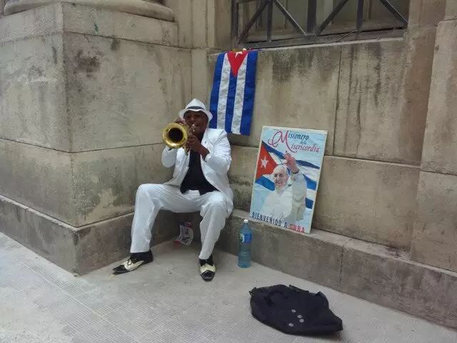 在教宗方济各去革命广场演讲那天,我们一大早就赶去,没想到方圆几公里内的道路都已被封锁,士兵在每一条街道站岗巡逻。我们只好回去看电视,在电视上也能充分领略到,古巴的年轻天主教徒(但或许他们只是少系了一条红领巾而已?)还是在用熟能生巧的共产主义集会模式迎接教宗——当教宗的车经过,一排接一排举着鲜花的青少年训练有素地、井井有条地次第奔跑上前,排山倒海的革命极权美学,做作得很自然地,被整合进天主教的圣洁秩序。