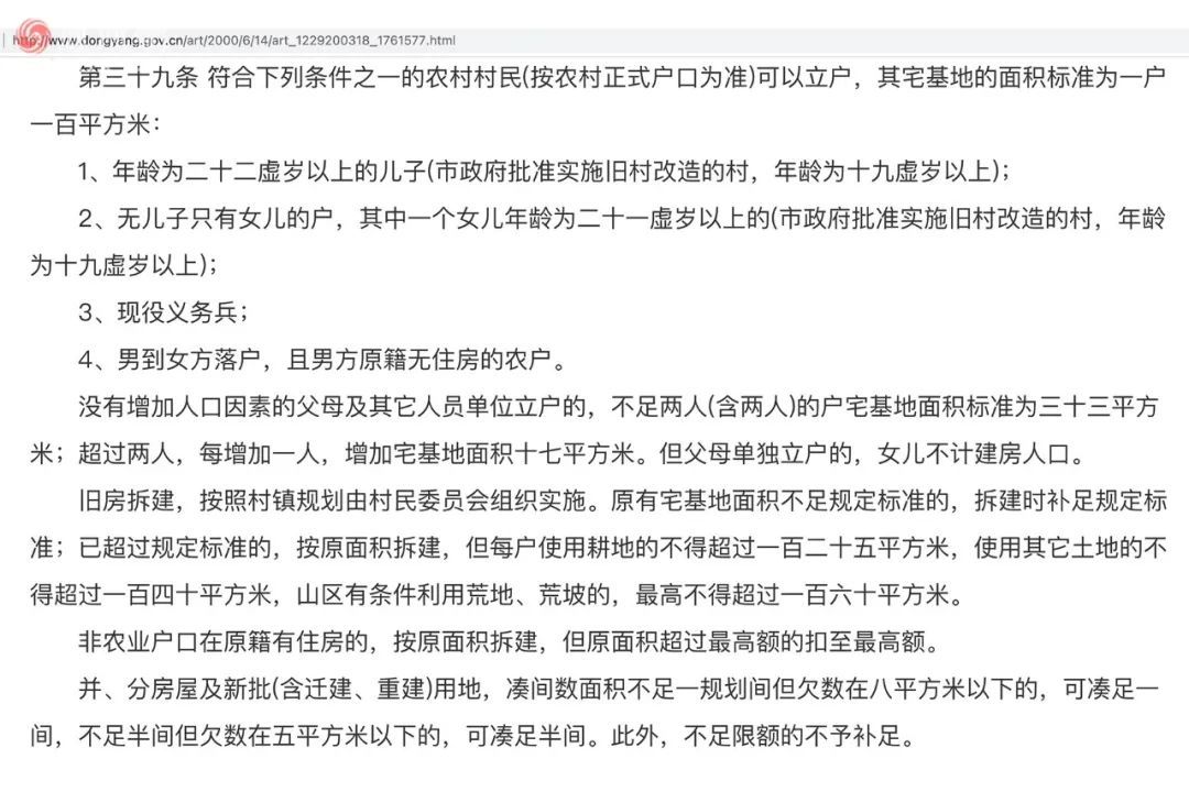 在信息公开的回复文件中,任雪萍找到了拦住她的“对手”,当时《东阳市土地管理实施细则》(下简称《细则》)39条规定,年满22虚岁的男性均可立户分宅基地,但条件相同的女性要想立户分宅基地,则需要家中无兄弟,甚至女儿不计算入建房人口。家有弟弟的任雪萍因而“不符合条件”。