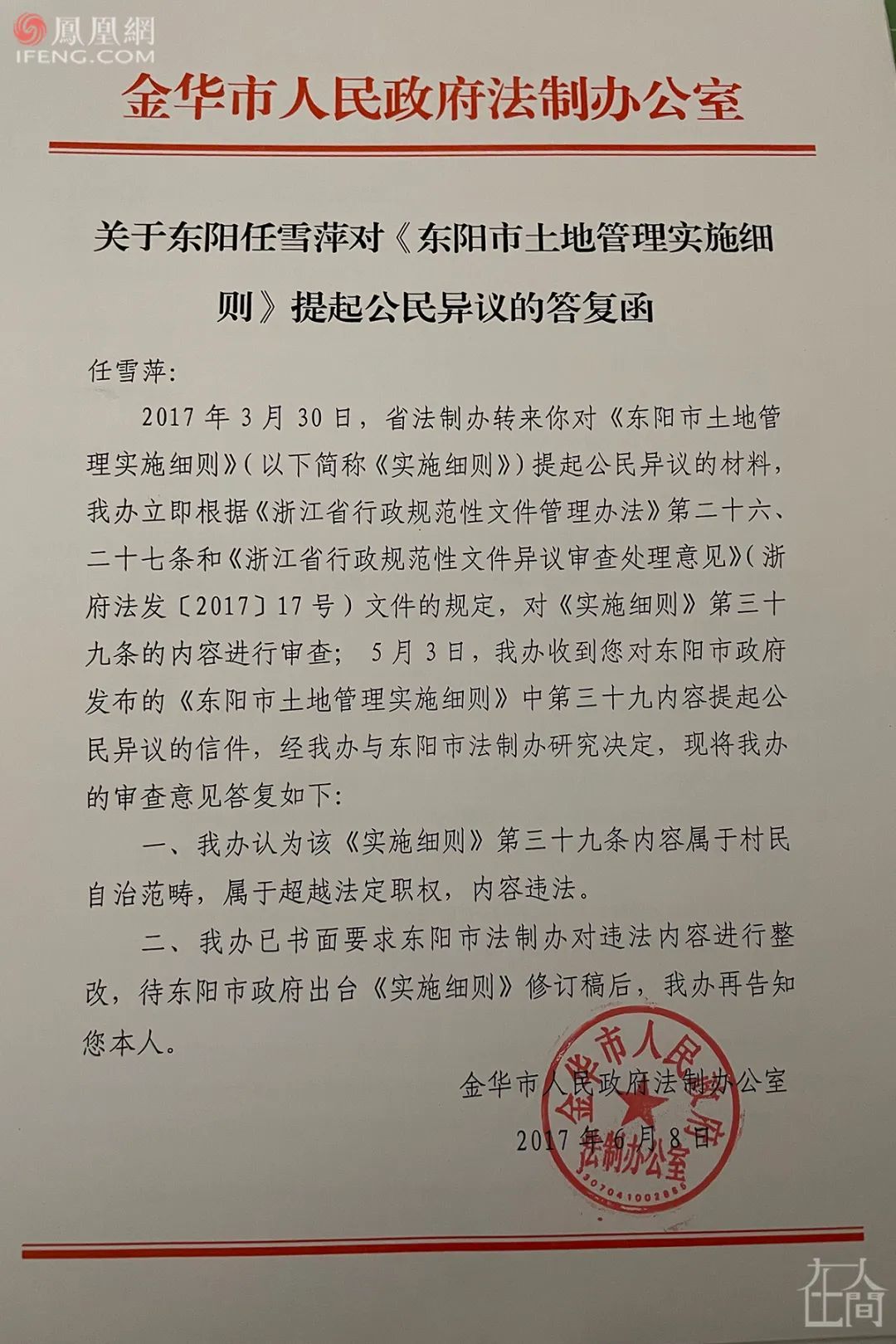 2017年的上半年,任雪萍都把精力放在推翻这项文件上,她逐级向政府机关的法制办提出对该文件的合法性审查。最终,在2017年6月,东阳市管辖所属的金华市政府法制办回复称,该条文“内容违法”。