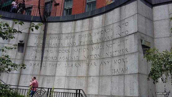 嗯,爱。那么,美国人民是怎么热爱中国的呢?他们把这一种爱,化为了金石镂刻的文字,镌刻在和平广场的石墙之上了:“They will beat their swords into plowshares and their spears into pruning hooks. Nations will not take up sword against nation, nor will they train for war anymore.”——–这,源自于【圣经】的【以赛亚书】第2章第4节:“他們要將刀打成犁頭,把槍打成鐮刀。這國不舉刀攻擊那國,他們也不再學習戰事。”