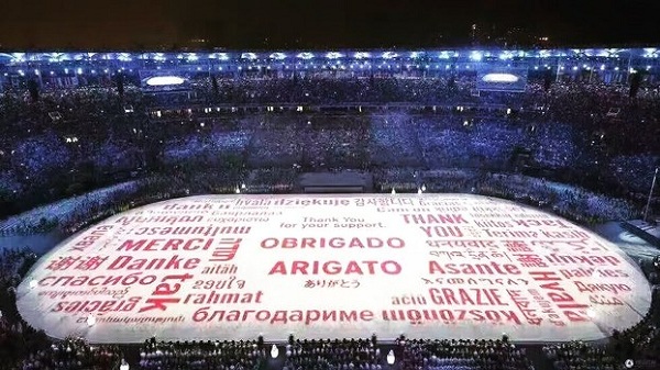 里约奥运会闭幕式上出现的投射在场地上的用各国文字表达感谢的光影中,有三个藏文字清晰而夺目。(视频截图)