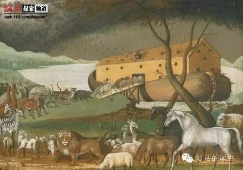 上帝耶和华看见人类“终日想的尽都是罪”,于是兴起大洪水在地上共一百五十天。唯独挪亚一家以及他们所带的“有血肉的活物,每样两个,一公一母”进入了方舟,从而得救,其它的都灭绝了。从此人类与上帝的创造物再也不像伊甸园里亚当和它们的关系了。