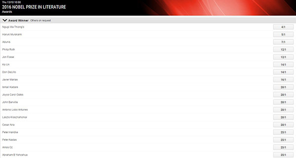 2016年诺贝尔文学奖宣布在即。而近日,英国博彩公司“立博”(Ladbrokes)的诺贝尔文学奖赔率表又发生了变化:村上春树(Haruki Murakami)不再领跑,而以5/1的赔率退居第二;赔率表第一的位置被肯尼亚作家恩古齐·瓦·提安哥(Ngugi Wa Thiong’o)以4/1的赔率夺去。