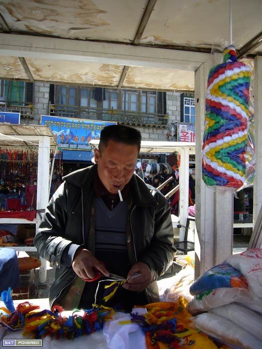 无论挂在哪里,编织“松阿”的人历来都是僧人和修行者。可是如今在拉萨的大昭寺广场上,大大小小、五颜六色的“松阿”挂满了专销哈达的货摊,那些摊主都是从内地来的汉人,所销售的“松阿”都是他们亲手编织的。我亲眼看见有个四川男人嘴里叼着香烟,双手编着“松阿”;还有一个四川男人一边抠着脚丫,一边编着“松阿”;几个四川女人倒是双手不停,编得飞快。他们编的“松阿”小的五元一根,大的十元、二十元、五十元不等,最大的如棒槌,百元不讲价。我问顾客是谁,他们说除了游客就是寺院,而且最大的买主就是寺院,比如拉萨城里香火很旺的扎基寺,就从他们这里成批购买“松阿”,然后再提价卖给朝拜者和游客。