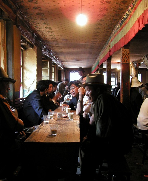 拉萨人爱喝甜茶到了痴迷的地步。拉萨的大街小巷有多少甜茶馆,数也数不清。那些有名气的甜茶馆,像“载追”、“革命”、“港琼”、“鲁仓”,每天云集的不知有多少老中青藏人。寺院附近也有甜茶馆,3月以前挤满了朝佛的香客和僧人。每个甜茶馆里都有乞丐踯躅其间,伸手要钱。