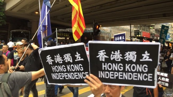 数以万计港人在“十一”中国国庆节当天走上街头抗议威权。部分示威者打出“香港独立”的标语。(美国之音记者海彦拍摄)