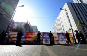 Chinese police impose tight security, sealing off the road leading to the Urumqi Intermediate People’s court, as the trial of Ilham Tohti begins, in Urumqi, September 17, 2014.