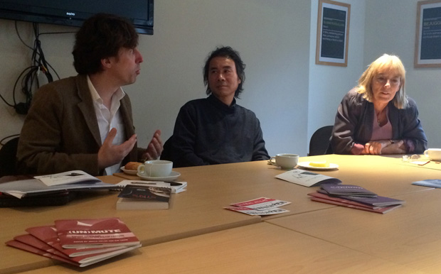 From left to right: Harvey Tomlinson from MakeDo Publishing, Chen Xiwo and translator, Nicky Harman at English PEN. (Photo: Aimée Hamilton)