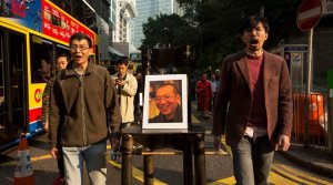 Evan Osnos writes of the imprisoned dissident Liu Xiaobo, whose picture is being carried by Chinese protesters. Credit Tyrone Siu/Reuters